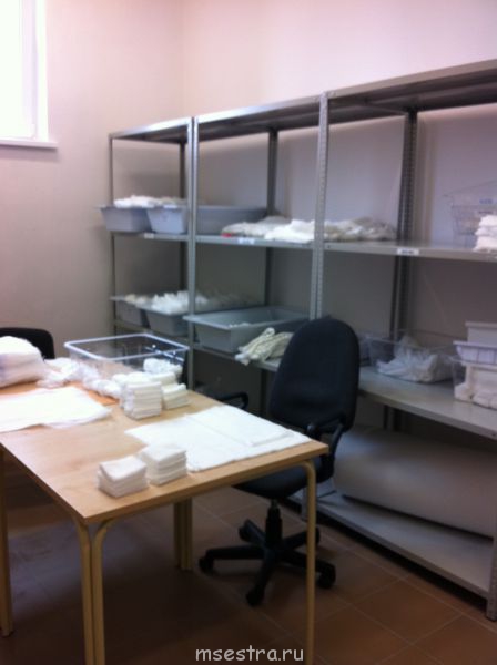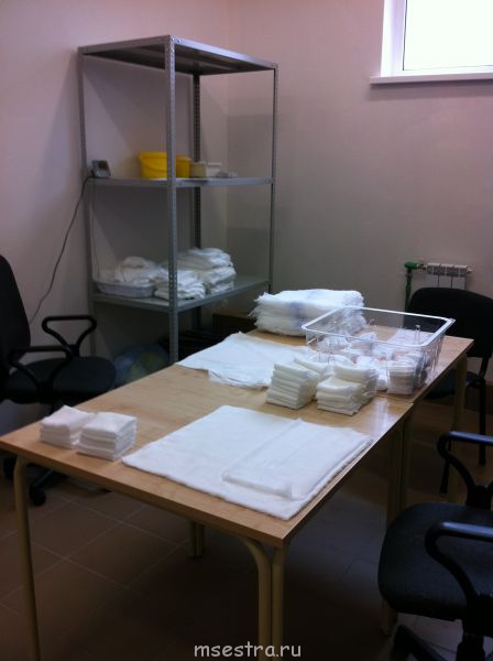 С 1 марта работает группа людей по изготовлению перевязочного материала. Со склада весь материал попадает в ЦСО и сотрудники готовят его в необходимом количестве и нужного размера. Все, включая оперблок, реанимацию, отделения очень довольны. Помещение не большое, приблизительно 3х4, расположено в цокольном этаже. Прикладываю фото рабочего места. Сразу оговариваюсь, пока нет контейнеров для хранения колющих и режущих, взяли желтые. Там у девочек скальпеля и ножницы. Ждем закупку и сразу поменяем.