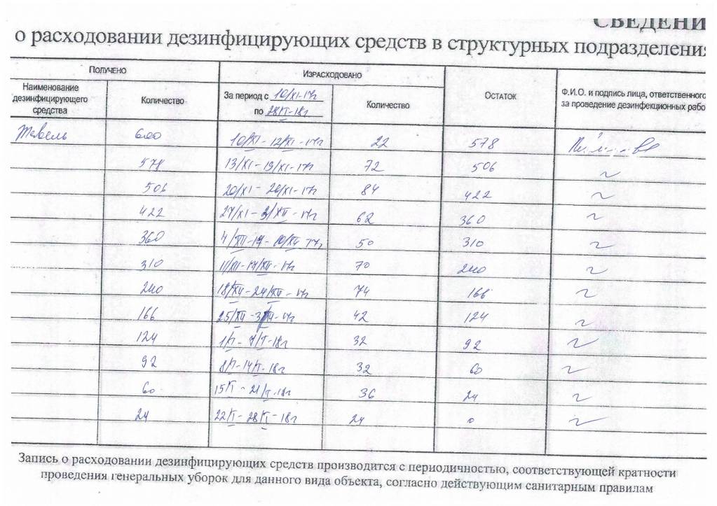 Только выдается дез средство целыми упаковками( флакон, банка, канистра), соответственно в журнале пишется только выданное на объект. Для проверяющих должны быть расчеты дез. средства на объект на месяц, согласно которым можно отследить дальнейшее расходование. Например, на текущую уборку 10 мл в день - 300 в месяц, на медотходы 20 мл в день - 600 в месяц и т.д.