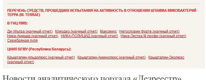 Там есть очень интересны факты экспериментальной оценки эффективности различных дезсредств в предписанных для применения туберкулоцидных режимах, выполненных в клинике и баклаборатории УНИИФ.