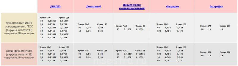 Если есть возможность, постарайтесь проводить дезинфекцию медицинских инструментов средствами, тестированными в НИИД, Это крайне важно. Изучаем картинку (отметим, что только Диадез исследовался в РНИИТО, остальные - не в РНИИТО, все на основе ЧАС) Видно, что концентрации по ЧАС у Диадеза и время экспозиций минимум раза в два "меньше и быстрее".c0x1k:а для дезинфекции отходов и инструмента не менее 60 мин