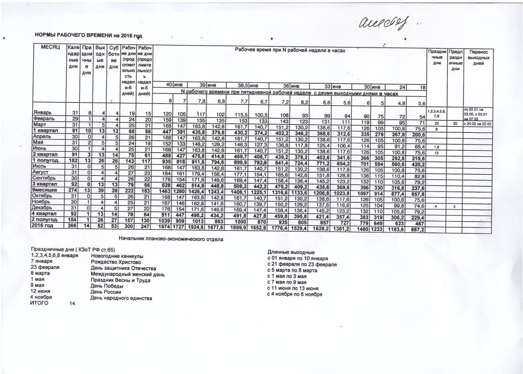 Извините,а на 2016 год не раздал Вам отдел производственный календарь???(на 38.5 час.неделя и 39 час.нед)Нам не раздали и не собираются...anestezistca: Нам, старшим, планово-экономический отдел раздает в конце года норму часов на следующий год. Я делаю копию заведующему и м/с в анестезиологию, реанимацию и тер БИТ. Так же нам дают штатное расписание. Большинство сотрудников ( что врачи, что м/с и мл. м/с) работают на 1,5 ставки, соответственно в декабре выработают 160,7 часов на ставку и 80,35 часов на совместительство - в итоге выйдет 10 суток. Те, кто работает на ставку выработает ровно ставку, в крайнем случае, переработает 7,3 часа (чтоб сутки не разбивать). На все остальные дежурства сверх нормы надоисать заявление на совместительство, ибо бухгалтерия их не оплатит. Совместительство с согласия сотрудника.