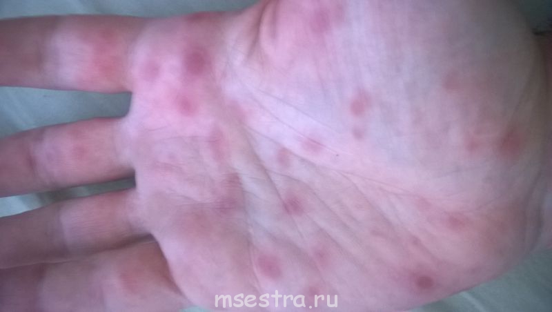 На пятом-шестом часу от появления t появляется сыпь. Сначала просто единичные ярко-красные пятна, диаметром 2-5 мм. Через 10-12 часов резкое, массовое высыпание на наружной и внутренней стороне кистей и стоп. Вид сыпь приобретает папулезный, местами очень похоже на герпетическую, но не мокнет.. Сыпь страшно зудящая, что не снимается ни чем, ни гормонами (местно и в\м) ни антигистаминами. В горле афты, болят страшно. Зуд проходит через три дня, вместе с t.Сыпь не бледнеет. На 5-7 день идет вторая волна t. , на сутки. После спада t сыпь начинает бледнеть, боль в горле проходит. Эпителий на месте сыпи отмирает. Кожа слезает, как перчатки.