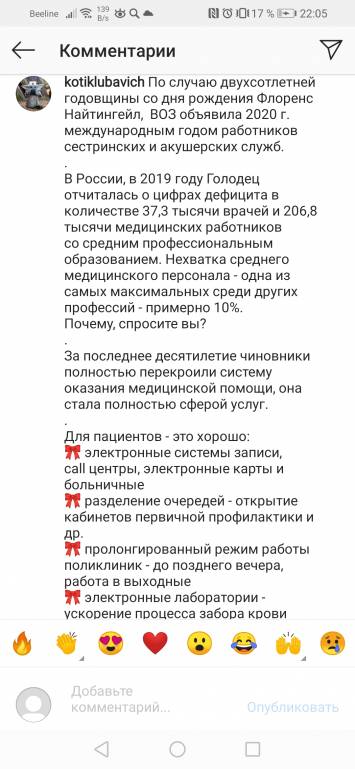 В профессии медсестер не просто кризис, там катастрофа, о которой даже говорить некому. Мы знаем Леонида Рошаля, который, как бы не поступал, но имеет голос и может что-то сказать. От имени медсестер сказать не может никто. Эта профессия умирает молча, и я думаю, а может, в России медсестры не нужны? Может, это закономерная эволюция и так надо? Я бы с удовольствием подискутировала на любой стороне: на стороне Зла (на сегодня профессия вырождается и умирает и этому лучше не мешать, всех заменят роботы или алгоритмы для не-медиков, важно сохранить хотя бы врачей) или на стороне Добра (надо вносить профессию в красную книгу и восстанавливать численность, а главное качество).