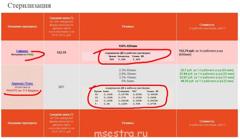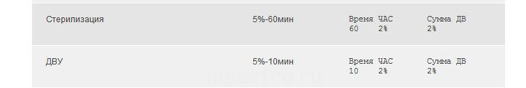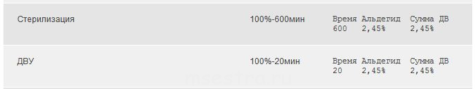 Отметим, что количество ДВ в растворах примерно одинаковое, а время стерилизации в 10 раз различается (60мин у средства на основе ЧАС и 600 мин у средства на основе альдегида).