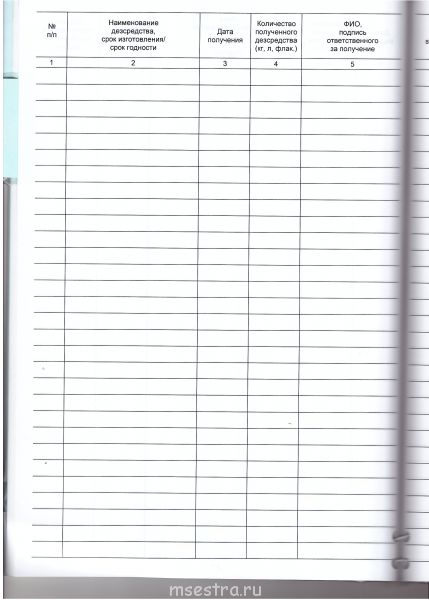 В приходе графы: № п/п, наименование дез. средства, № партии, срок годности, дата получения, кол-во, подпись получившего.