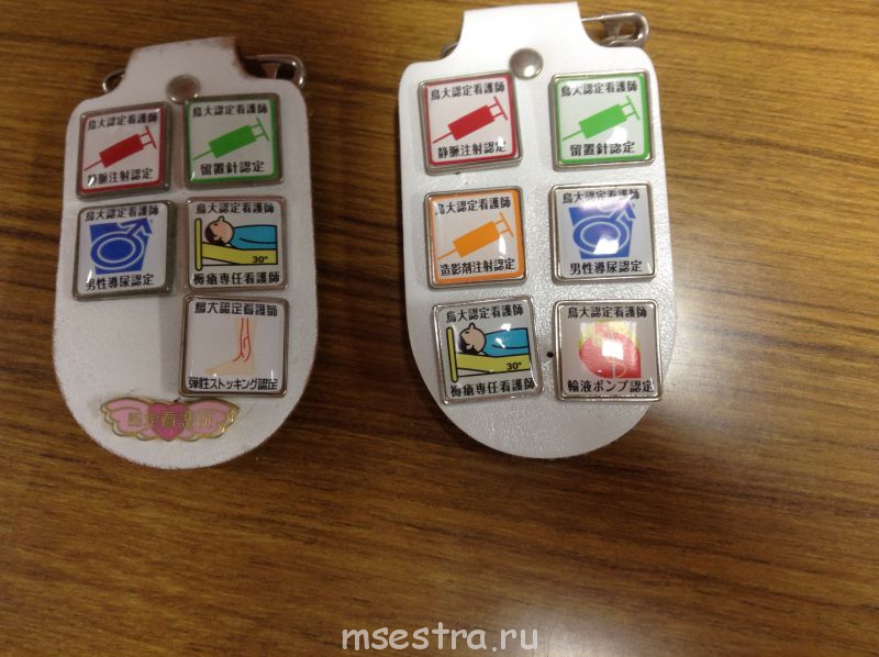 Для того чтобы выполнять ряд важных манипуляций, сестры в Японии должны пройти специальные курсы и получить разрешение. Это документ и значок, который носят на форме. Глядя на сестру, становится понятно что она может выполнять. Когда значков 1-2 их носят на нагрудном кармане, когда много, то на специальном шевроне, который прикалывают к рукаву на плече.