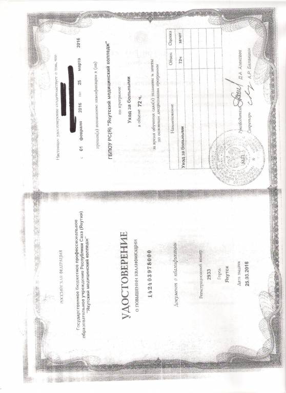 Якутский медколледж, о том, что прошли цикл повышения квалификации.. но на младшую медсестру пока никак не получается.
