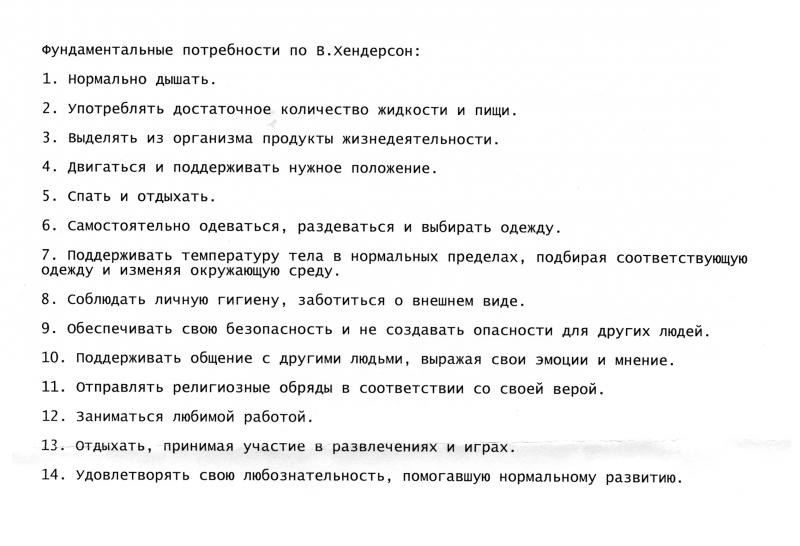 Нам преподают сестринский процесс по Хендерсон. Но в качестве 14 потребностей дают - см. рисунок (уч-к Обуховец).